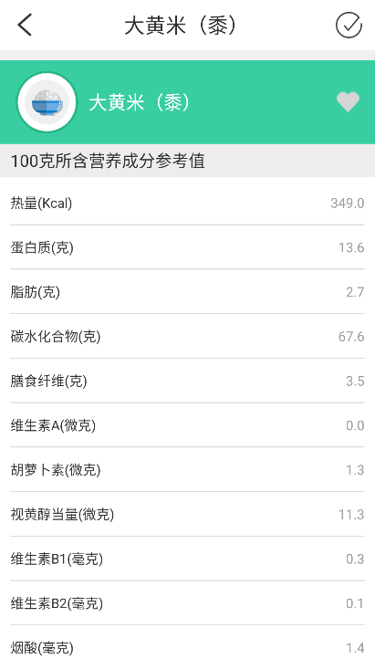 进入食品库挑选对应的食品,系统会显示该食品每100克所含的热量以及各类营养元素信息。