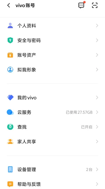 vivo账号也就是vivo账号中心,英文名称是vivo Account,它是vivo系统的账号管理服务软件。拥有vivo账号后,用户能够开展个人资料管理、安全与密码设置、账号资产查看、拟我形象创建、云服务使用、查工、家人共享以及设备管理等多项操作。并且在进行密码相关操作时,安全性也会更高。