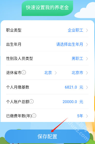 安装并打开养老金计算器,接着选择职业类型、出生年月、性别等信息,最后点击保存配置按钮。
