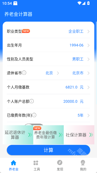 养老金计算器是一款能计算职工养老金的手机软件,只需选择职业类型、出生年月、所在地区、个人月缴基数等参数,就能帮我们算出养老金。无论你是企业职工、机关事业单位人员、城乡居民,还是灵活就业者或个体户,这款计算器都能为你计算养老金,是一款小巧实用的手机应用。