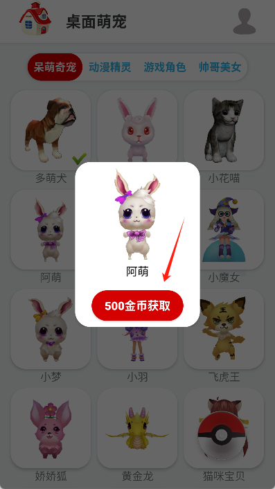 确定选择后,点击宠物并在弹窗中点击获取按钮。