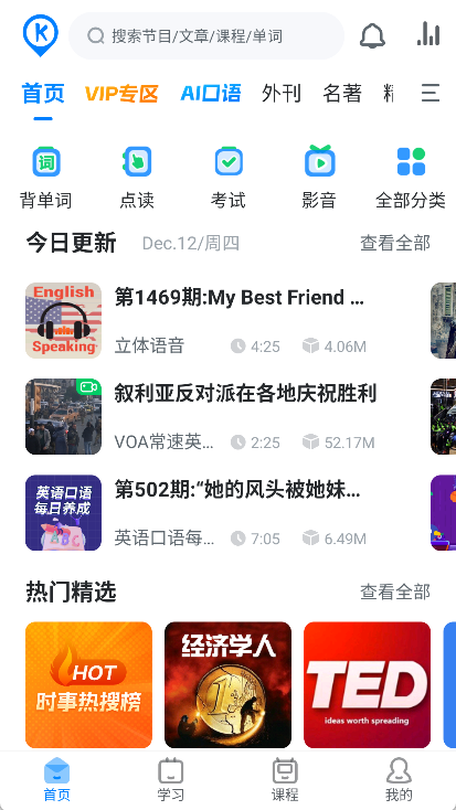 - 海量内容:3000档优质英语节目,配备双语字幕,另有30万篇有声资源。