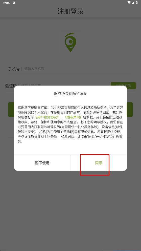 在服务协议与隐私政策的弹窗里,点击【同意】按钮,确认接纳相关条款后,即可进入注册登录界面。