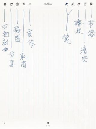 双击笔记即可新建空白页,页面上方的功能按钮从左到右依次是:返回封面、分享、上下步、画笔、马克笔、橡皮擦、清除整页以及设置标签。