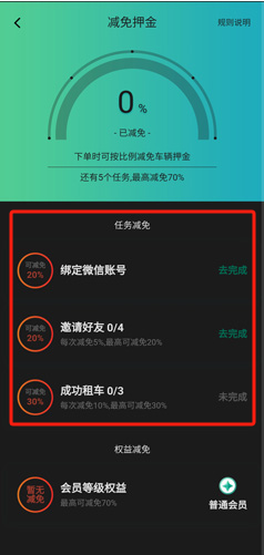 进入后通过完成绑定微信账号、邀请好友等任务来减免押金。