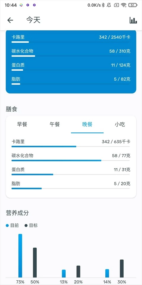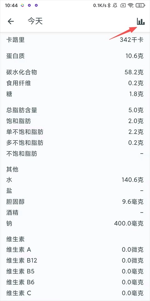 4、接着回到日记页面,点击总结下方的进食记录,就能查看当天摄入的营养量。