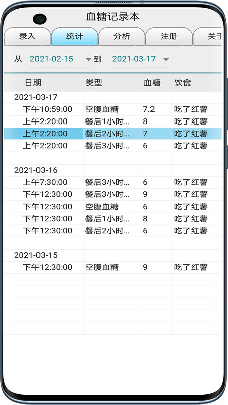 血糖记录本是一款用于录入、统计和分析血糖数据的软件,它能清晰记录每次血糖测量结果,支持按时间筛选查看,还配有直观的曲线图,适合需要经常监测血糖的用户在手机上安装使用。该软件记录内容详细,包含饮食、用药等备注信息,欢迎大家体验。