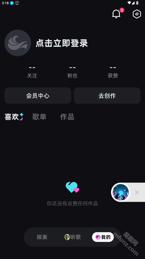 我的页面支持查看“喜欢”“歌单”与创作作品,同时也能进入创作中心。