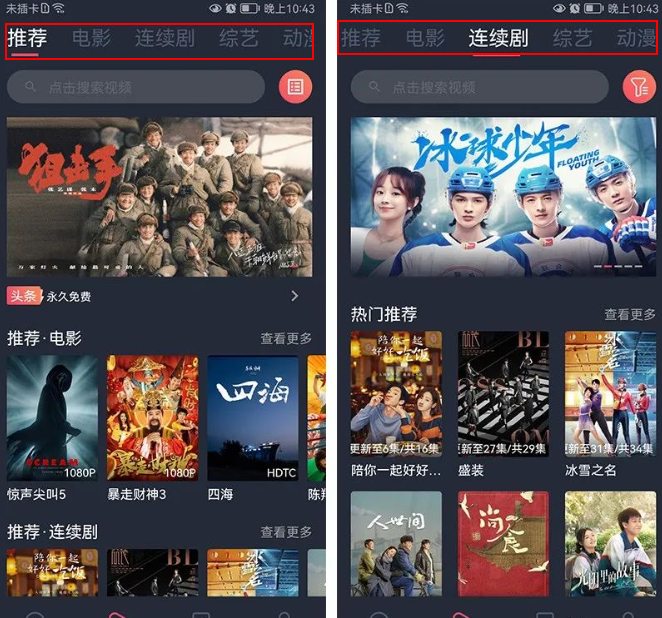 安装完成后,首页设有推荐、电影、连续剧、综艺、动漫等多个栏目。