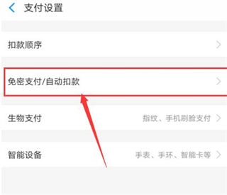 在支付设置页面里,找到并点击“免密支付/自动扣款”选项,具体位置可参考下图: