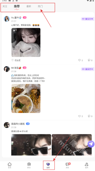4、切换到【动态】页,点击顶部【热门】标签,浏览热门动态内容。