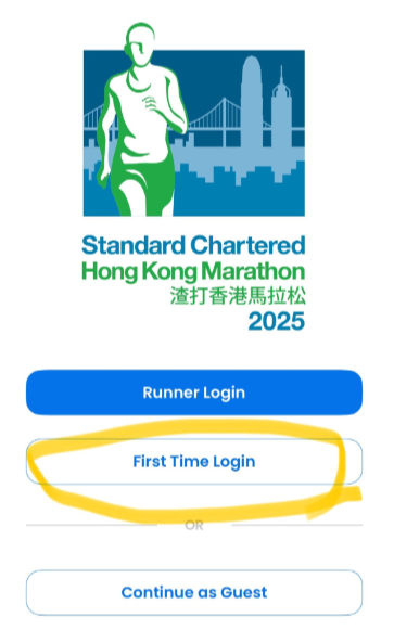 1、打开渣打香港马拉松App,选择 “首次登录”(First Time Login)。