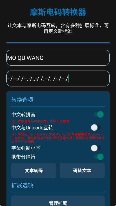 4. 可以选择复制转换后的摩斯电码,或播放音频以听取摩斯电码的声音。