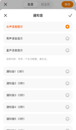 2、添加生日或者纪念日,设置通知音,并点击保存。