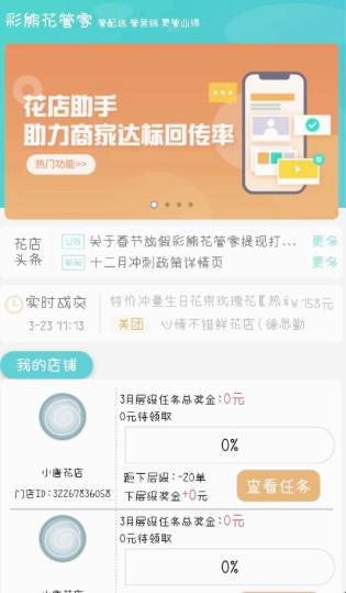 1、打开彩熊花管家,首页有各种店铺经营信息,你可以随时查看店铺任务。