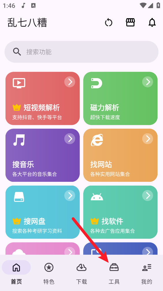 乱七八糟工具箱,集成了多种常用功能的轻量级工具箱,包括短视频解析、音乐合集、磁力解析、壁纸等各种功能,无需登录注册即可直接使用,界面设计清晰直观,并且全程干扰,进入快速查找并启动所需功能,带来便捷、高效且纯净的工具使用体验。