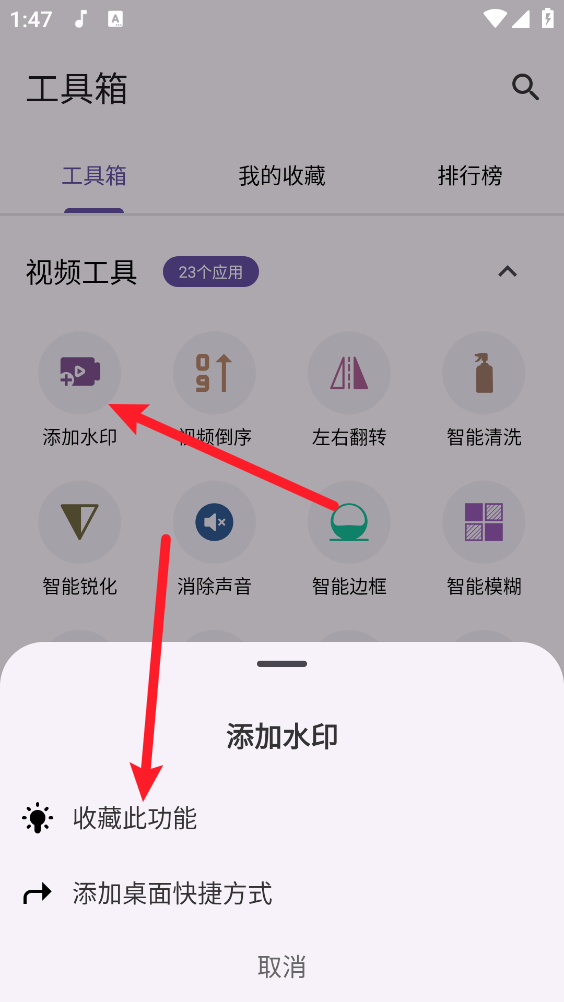 3、长按所需收藏的功能,弹出弹框,点击"收藏此功能"即可。
