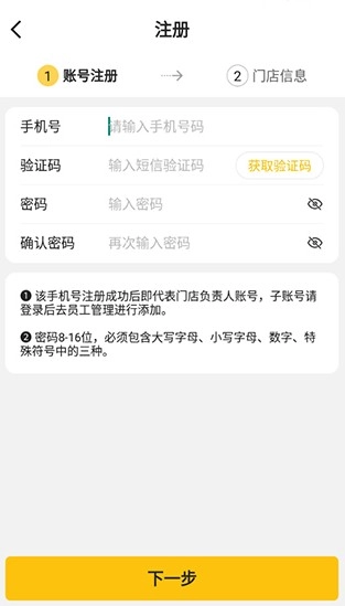 这里的操作分为两个步骤,分别是账号注册与门店信息填写,用户只需按照提示输入对应的内容就可以了。