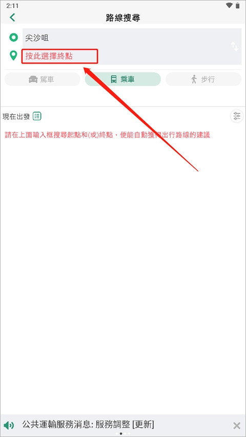 香港旅游搬迁图标示了出发地、目的地、上下车站点以及转运站点的具体位置。