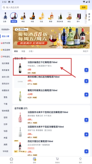 2、在分类页面,选择红酒分类,进入红酒商品列表页面。