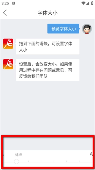 4、在字体大小页面,拖动滑块调整到需要的字体大小,完成设置。