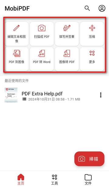 1、首页整合了编辑文本与图像、扫描生成PDF、压缩文件、PDF转Word、图像转PDF等丰富功能。