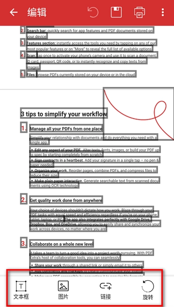 编辑功能:支持对PDF内的文本与图像进行直接编辑,还能插入文本框、链接、图片,以及调整页面的旋转角度。