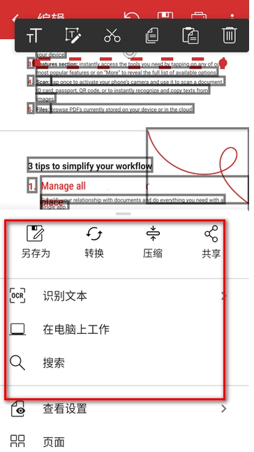 文档优化与分享服务:支持PDF压缩功能来缩减文件大小,处理完毕后能便捷地进行文档的保存、另存为或分享操作。