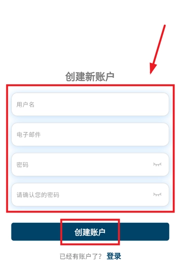 在新建账户的页面中,依次填写用户名、电子邮箱和密码,之后点击“创建账户”按钮就完成了。