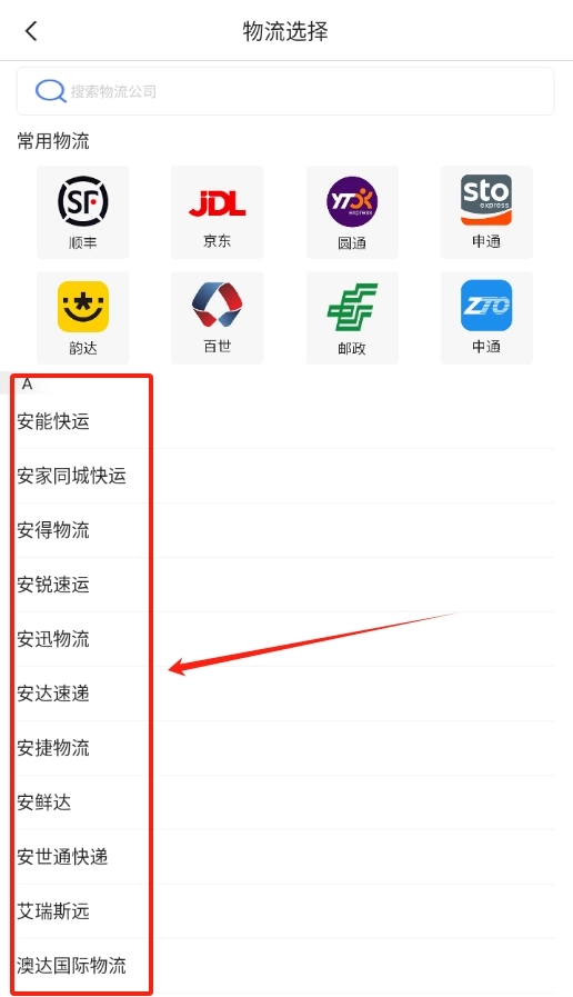 2、进入查询页面后,从列表里挑选你快递对应的物流公司。