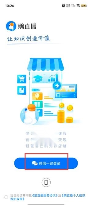 打开你的鹅直播应用程序,选择微信登录方式,完成授权登录操作。