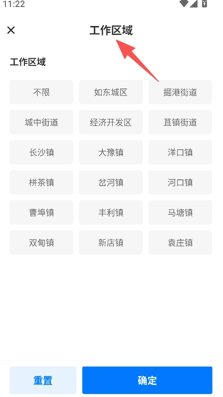 提供工作区域选择功能,用户进入工作区域页面后,可选择东城区等目标区域,以此明确本地求职的岗位范围。