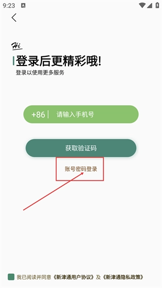 在登录界面,除了验证码登录方式外,您还可以选择【账号密码登录】选项。不过在填写对应的账号信息进行登录前,需要先勾选相关协议。