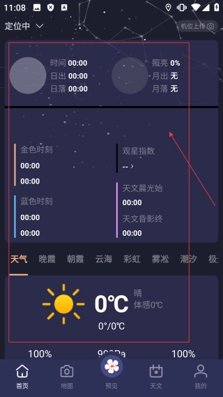 1、进入首页界面,可【查看日出日落、金色时刻、天气状况等天文与天气信息】,享受天文天气综合查询服务。