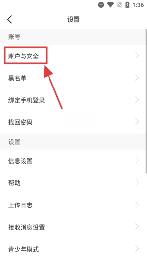 在设置界面点击下方的账号与安全功能。