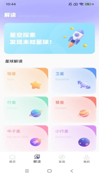 进入解读专区,这里有恒星、卫星以及彗星、小行星等各类资源可供查看。