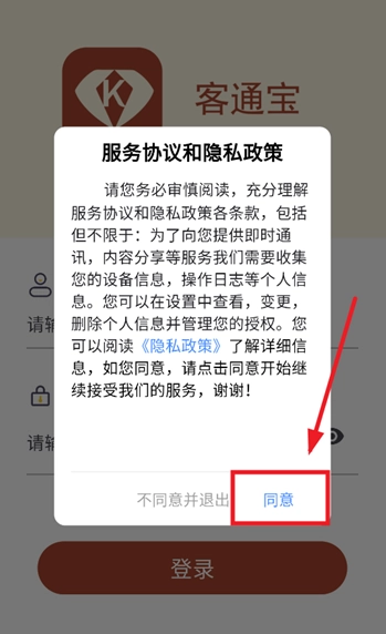 安装并打开客通宝,先同意服务协议和隐私政策;