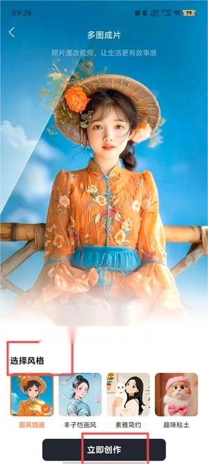 在多图成片界面选择你的视频风格,点击立即创作。