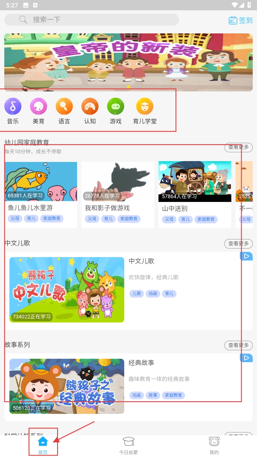 1、打开应用,进入【首页】,在【中文儿歌】板块点击【熊孩子中文儿歌】。