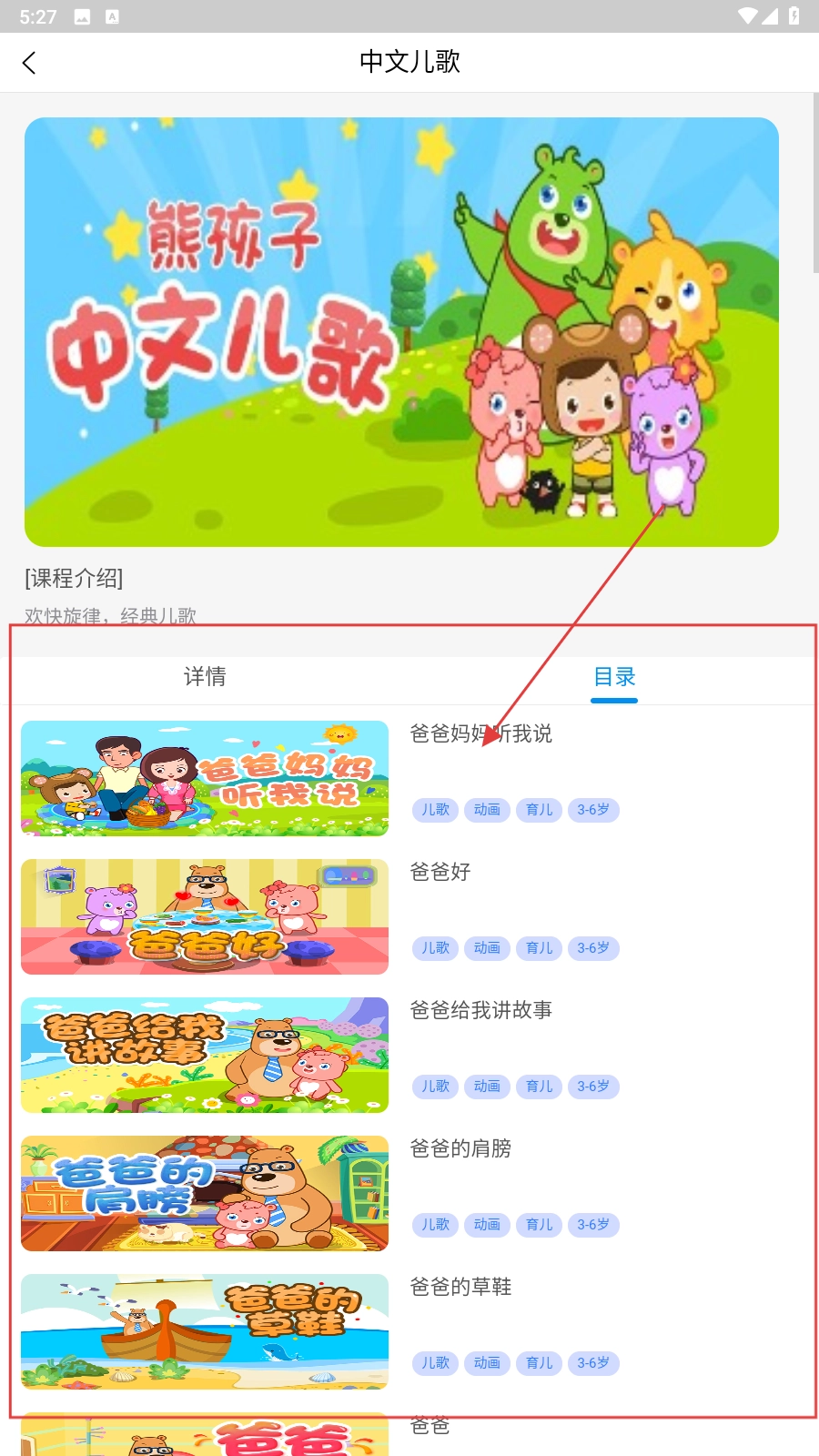 2、进入【中文儿歌】详情页面,在【目录】中选择想听的儿歌,如【爸爸好】。