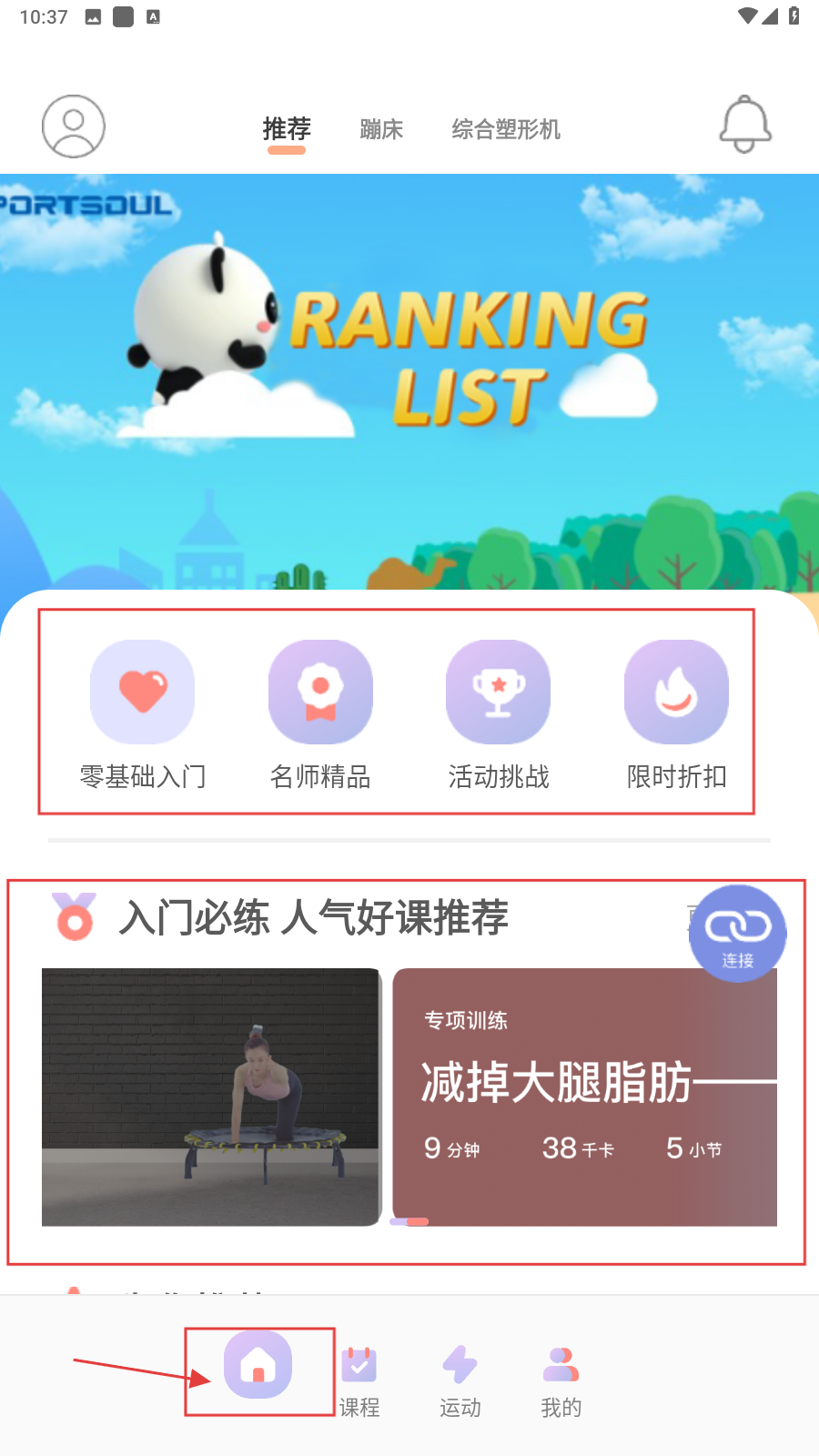 1、打开应用,在【首页】点击课程分类(零基础入门、名师精品等)或推荐课程,进入课程选择操作环节。