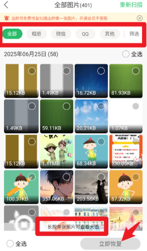 2、在照片恢复页面,能够依据来源分类来筛选想要找的图片,长按图片可以查看大图预览,并且支持批量勾选进行恢复操作。