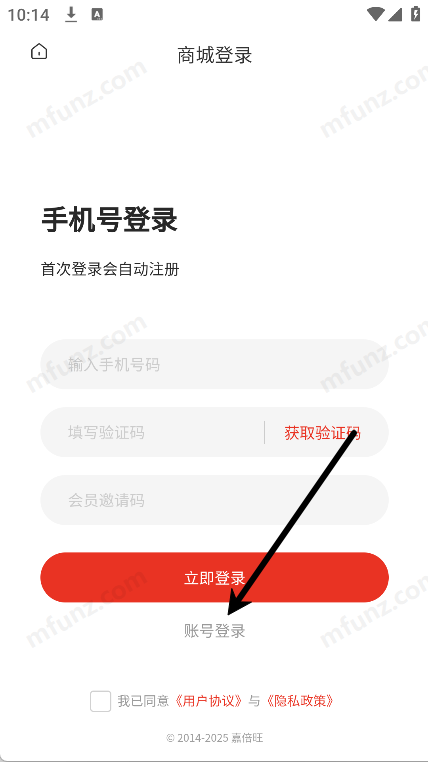 4、输入手机号码与验证码就能登录(首次登录系统会自动完成注册)