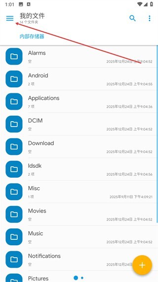 2、点击页面左上角的三条横线图标以展开侧边栏,通过该侧边栏能够查看文件在内部存储器中的使用状况。