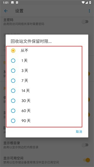 3、找到回收站文件的保留时限选项,点击该选项以弹出选择菜单。