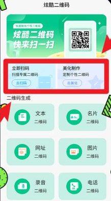 1、开启炫酷二维码制作功能,在首页选择并点击需要的二维码类型按钮,例如文本、网址或者图片等类别。