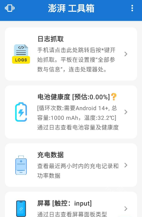 包含电池健康查询、充电数据监测、屏幕触控测试、日志抓取等近百种工具。