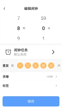 2、可以设置闹钟的时间,重复次数,和贪睡的时间,再点击闹钟任务