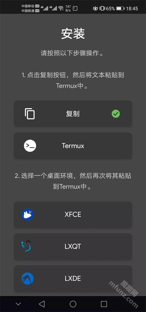 一键安装系统:把命令复制到Termux里,就能自动完成Linux系统的安装和配置了。