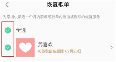 在恢复歌单的页面中,能看到自己曾经删除的歌单列表,从中勾选想要恢复的歌单后,点击右下角的“恢复”图标就可以了。